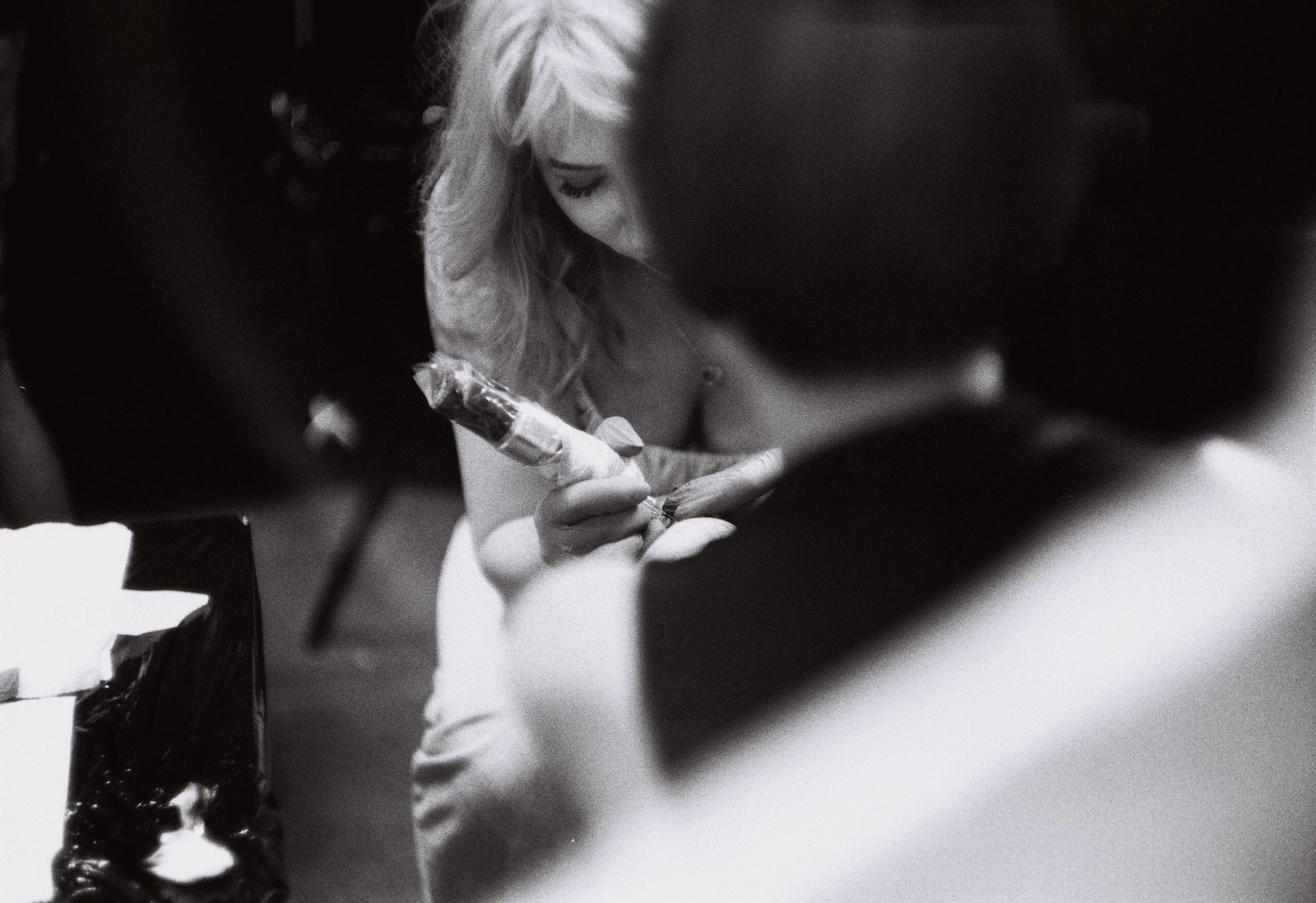 A moment today at TattooFest in Kraków that keeps replaying in my mind. Among the buzz of machines, the pulsing music, and the flow of curious onlookers, there was this one quiet, almost invisible pocket of stillness. A woman — the tattoo artist — leaned in with complete focus, the tattoo machine in her hand wrapped neatly in plastic. She looked so calm, her pink hair slipping forward, eyes tracing a line only she could see.